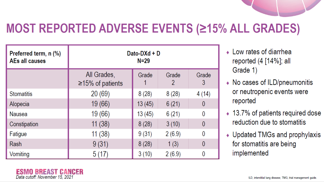 Ⅰ期TROPION-PanTumor01研究入组了44例接受过标准治疗后复发/进展的mTNBC(其中68%接受过≥2线治疗)。2021年SABCS大会报道的数据显示,Dato-DXd治疗的ORR为34%,疾病控制率(DCR)为77%;而既往未经过拓扑异构酶-I抑制剂为基础的ADC药物治疗的患者ORR和DCR则分别达到52%和81%。安全性表现良好,其中≥3级TEAEs率为23%(10/44)。