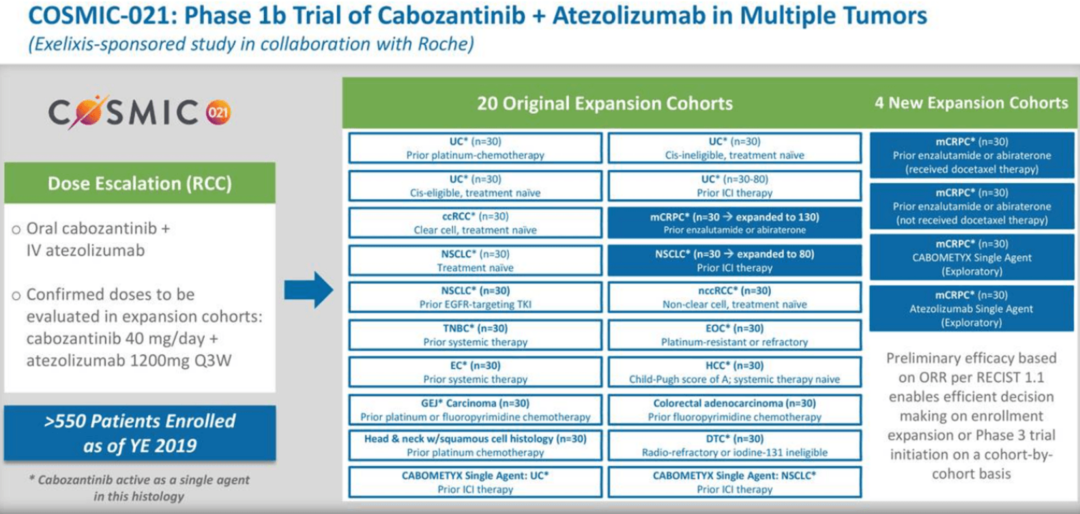 COSMIC-021研究是一项多中心、开放标签的1b期试验,旨在评估卡博替尼联合阿替珠单抗,分为剂量递增阶段和扩展阶段。剂量递增阶段已确定卡博替尼剂量为40mg/天,阿替利珠单抗为1200mg Q3w。扩展阶段共包括尿路上皮癌、肾细胞癌、前列腺癌、非小细胞肺癌等12个瘤种在内的24个队列。