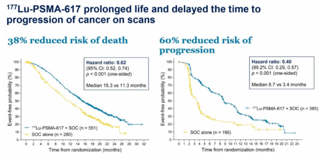 2020年ASCO报道中位随访11.3个月的数据显示达到主要终点,LuPSMA组相较于卡巴他赛组的PSA50-RR显著提高近一倍(66% vs 37%),PSA-PFS风险显著降低37%(HR 0.63,95%CI:0.45~0.88)。本次会议将报道中位随访3年的OS结果。