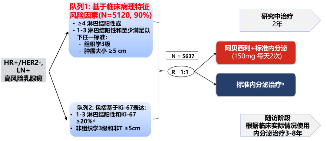 研究设计:全球Ⅲ期monarchE研究,共纳入5637名早期HR+/HER2-患者,按照1∶1随机分为队列1(N=5120)和队列2(N=517),队列1具有较高的复发风险。两组均接受为期2年的阿贝西利联合ET或单独ET辅助治疗,本次报道队列1研究结果。