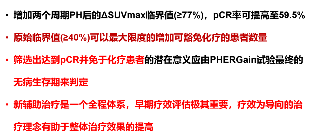 研究方法:研究者采用ROC曲线,分析了单纯给予新辅助双靶治疗(曲妥珠单抗和帕妥珠单抗)的HER2阳性乳腺癌患者SUVmax在新辅助治疗2周期后较基线下调的最佳截断值,并采用新的截断值,预测了新辅助治疗后达到pCR的患者比例,与PHERGain试验的结果进行对比,筛选出免于化疗的HER2阳性乳腺癌患者。