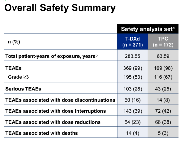 王碧芸教授:DB-04研究显示T-DXd的安全性非常好。T-DXd治疗组≥3级治疗不良事件(TEAE)低于对照组(53% vs 67 %),以血液毒性、胃肠道毒性为主,严重级别多为1~2级,临床处理经验丰富。T-DXd的停药率却高于对照组(16% vs 8%),主要由间质性肺病(ILD)引起。前期研究表明各个药物引起的ILD,若早期发现并及时处理是比较容易控制的,提示大家在临床中应对ILD给予重视、加强医生及患者教育,一旦发现呼吸系统的不良反应症状,及时诊断、及时治疗,能够取得很好的控制。
