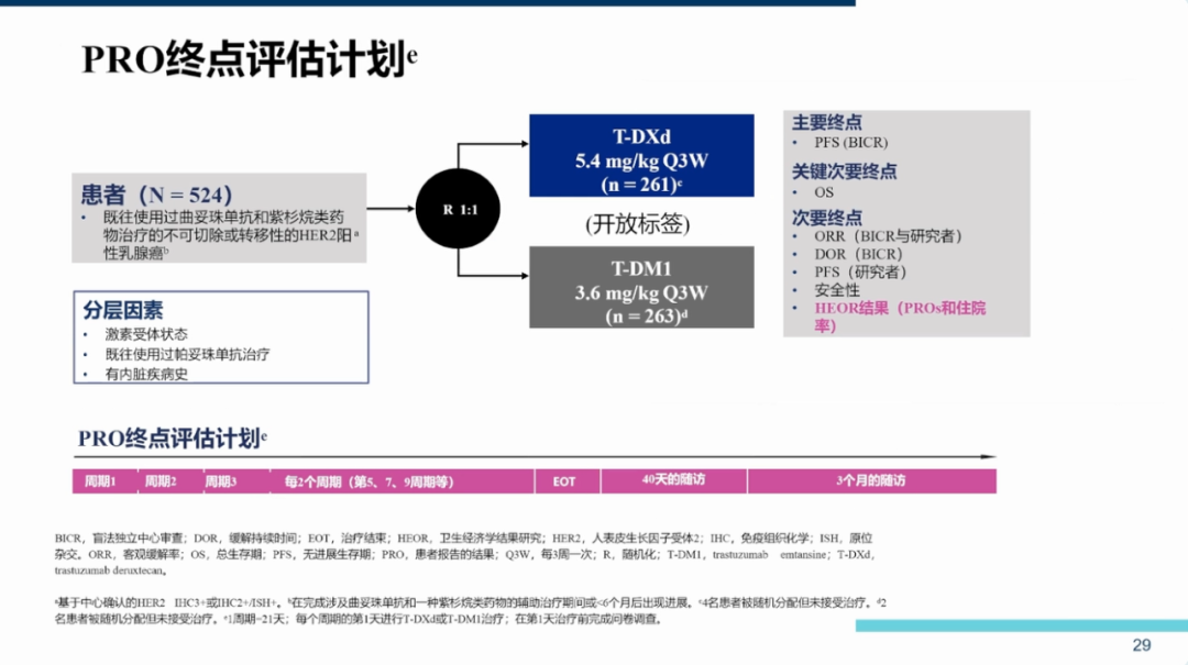 2022年ESMO BC会议上也有DESTINY-Breast03研究更新的数据,即患者报告结局(简称PRO),PRO是以患者为中心,强调患者的体验、观点和需求,由患者来报告他的感受,也是一个对目前现有的临床试验非常重要的补充。通过PRO可以发现,T-DXd组和T-DM1组具有一致性,在治疗的后半程,T-DXd组在数值上要高于对照组,且在疼痛症状和情绪功能方面,T-DXd组更具优势。另外,至首次住院处理相关问题的中位时间在T-DM1组和T-DXd组分别是60天和219.5天,T-DXd也具有明显优势。