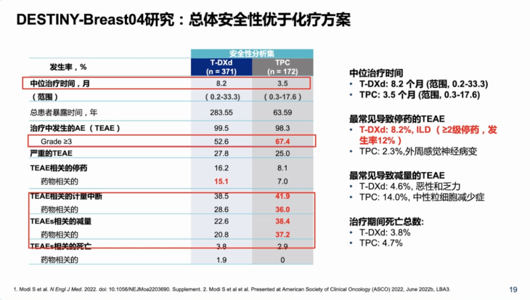 从安全性方面来看,3级以上不良事件(AE)发生率T-DXd组低于TPC组,T-DXd的中位治疗时间更长。T-DXd最常见的导致停药的AE主要是间质性肺疾病,发生率为8.2%;TPC组主要是外周感觉神经病变,发生率为2.3%。T-DXd组和TPC组治疗期间死亡总数发生率分别是3.8%和4.7%。因此,无论是总体安全性、还是暴露时间调整后的AE发生率(EAIR),T-DXd组都优于TPC组。