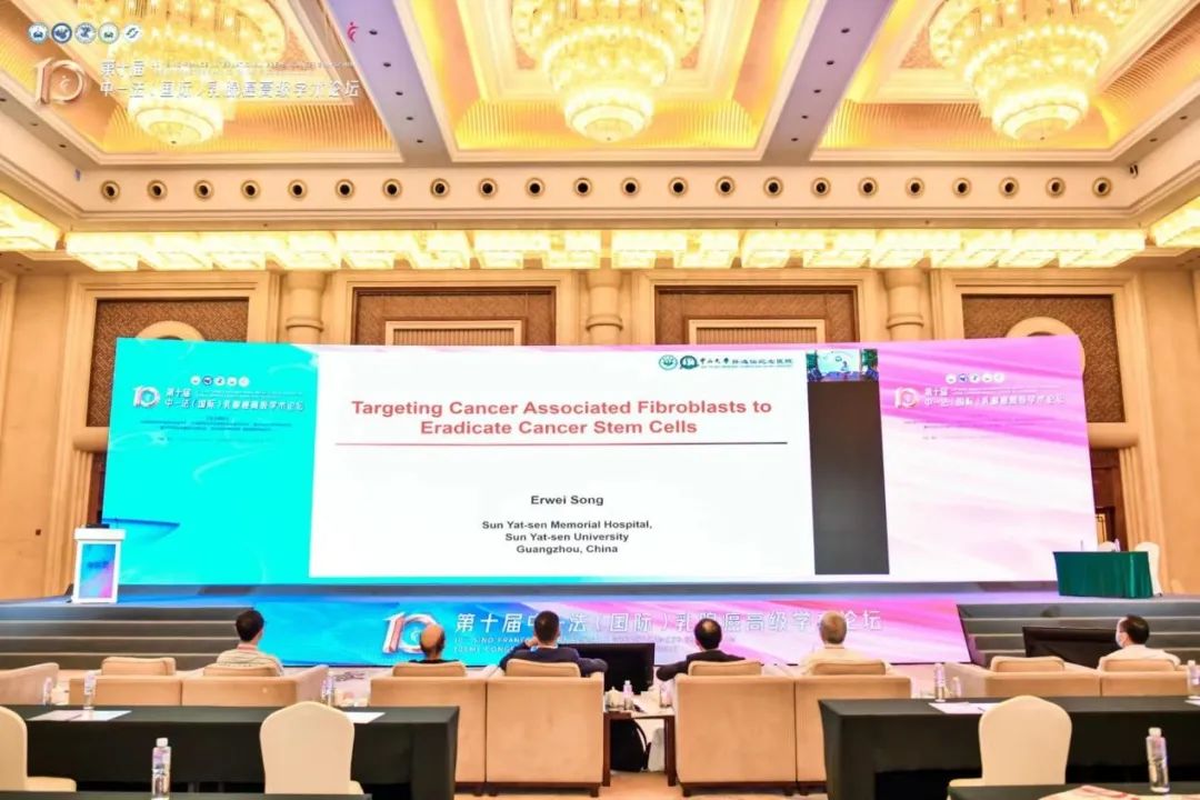 大咖论道环节,中山大学孙逸仙纪念医院宋尔卫院士带来了《Targeting Cancer Associated-Fibroblasts to Eradicate Cancer Stem Cells》的讲课,他在讲课中指出,在肿瘤微环境的所有基质细胞中,肿瘤相关成纤维细胞(CFAs)是最丰富的,并与癌症的进展密切相关。CAFs通过细胞与细胞的通讯以调节肿瘤细胞和其他基质细胞的生物学特性,释放大量的调节因子,合成和重构细胞外基质,从而影响癌症的发生和发展。