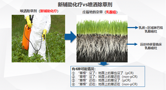 不可否认“地面上的草没了(pCR)”,其地面下的“草根(亚临床转移灶)”被除掉的概率要比那些“地面上还有草(non-pCR)”要低。但是,不能将“地面上的草没了(pCR)”与“地面下的草根(亚临床转移灶)没了(生存改善)”完全划等号(见图3)。