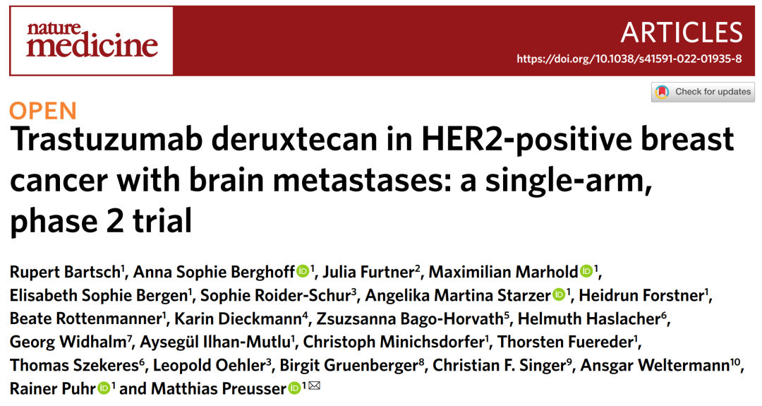 乳腺癌脑转移的发生率仅次于肺癌,对患者的生存期和生活质量带来严重威胁。局部治疗以及一些小分子TKI是目前临床常用的HER2阳性乳腺癌脑转移疗法。在DESTINY-Breast03研究中,T-DXd针对基线脑转移稳定期的患者展现了可观的颅内缓解率和无进展生存期获益。那么,对于脑转移活跃期的HER2阳性乳腺癌,T-DXd是否也有良好的疗效和安全性?近期,《自然-医学》(Nature Medcine)在线发表了一项来自奥地利的2期TUXEDO-1研究回答了这一问题[1]
