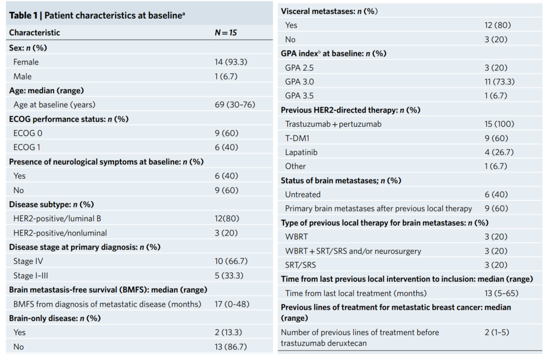 2020年7月30日~2021年7月23日期间共入组15例患者(14例为女性),中位年龄69岁(30-76岁),60%的患者为ECOG 0分,80%的患者预后分级指数(GPA)为3.0~3.5,40%的患者基线有神经系统症状,80%的患者为Luminal B型。既往接受过局部治疗、接受过T-DM1治疗进展的患者比例均为60%。IV期疾病和内脏转移疾病的患者比例分别为66.7%和80%。