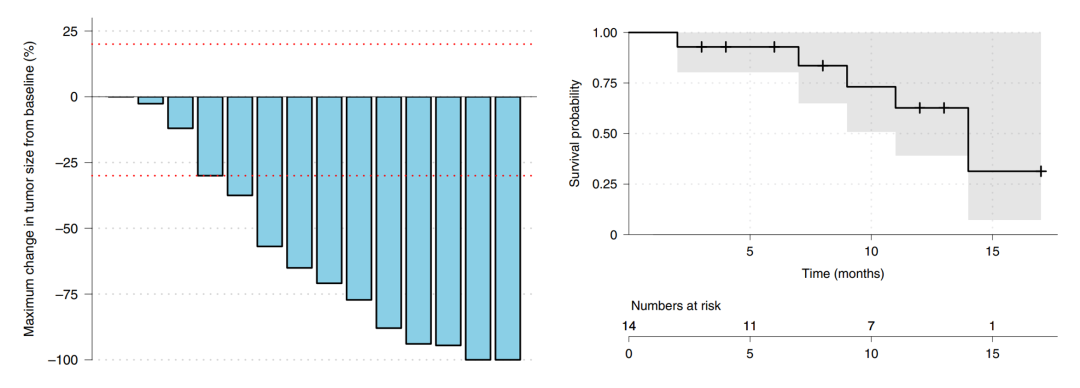 次要终点:在13例基线有颅外转移的患者中,5例(27.8%)观察到PR(根据RECIST 1.1评估),其余颅外转移均为SD;在8例基线颅外转移病灶可测量的患者中,5例(62.5%)达到PR,其余均为SD。中位无进展生存期(PFS)为14个月(95%CI:11.0个月–NR),且PFS与既往脑转移局部治疗、T-DM1治疗、HR状态、ECOG或GPA无关。总生存期(OS)尚未达到,中位随访12个月时有3例死亡(1例死于脓毒症,2例死于疾病进展)。
