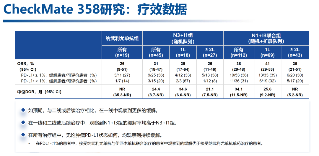2022年ESMO大会报道的1/2期CheckMate 358研究则探讨了在不考虑PD-L1的情况下采用纳武利尤单抗±伊匹木单抗的双免或单免治疗,且双免治疗包括N3+I1(NIVO 3 mg/kg Q2W+IPI 1 mg/kg Q6W)和N1+I3(NIVO 1 mg/kg Q2W+IPI 3 mg/kg Q3W×4个周期,随后NIVO 240 mg Q2W)两种组合。其中,N3+I1组和N1+I3一线治疗的ORR为39%和41%,高于≥2线治疗的26%和35%[14]。这些结果提示NIVO+IPI双免疗法在一线治疗中的缓解率更高,而且N1+I3的组合方式更佳。