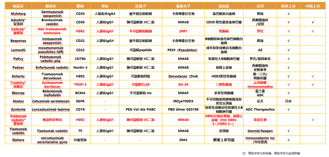 ADC药物也从最早的血液肿瘤扩展到了当下的实体肿瘤,至今国际上研发的ADC药物有160多种,其中50多种终止了研发。正式获批于临床的也仅有15款药物,美国有13款,中国有5款ADC在国内获批,包括作用于乳腺癌的T-DM1、SG及T-DXd,作用于急性髓性白血病的Adcetris,以及国产原研的RC48维迪西妥单抗。