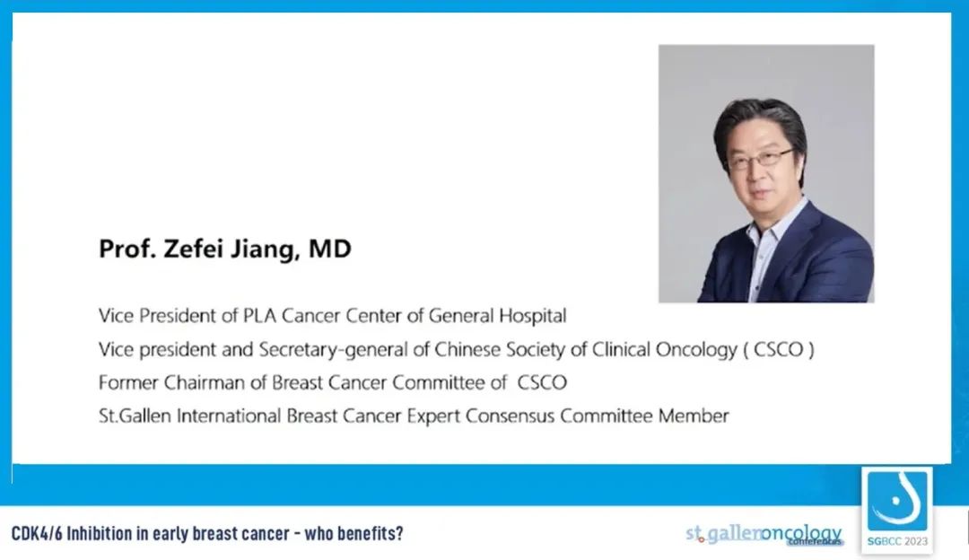 第18届St.Gallen国际乳腺癌大会(SGBCC 2023)于当地时间2023年3月15日在“世界音乐之都”维也纳拉开帷幕。SGBCC汇聚全球各地的乳腺癌意见领袖,将围绕最前沿、最具争议的早期乳腺癌诊治话题展开讨论和投票,形成每两年一更新的St.Gallen早期乳腺癌国际专家共识指南。在大会第一天举行的“SGBCC Academy”(SGBCC学院)环节,江泽飞教授带来了精彩的演讲——Who can benefit from adjuvant therapy with CDK4/6 inhibitors?(谁可以从CDK4/6抑制剂辅助治疗中获益?)。