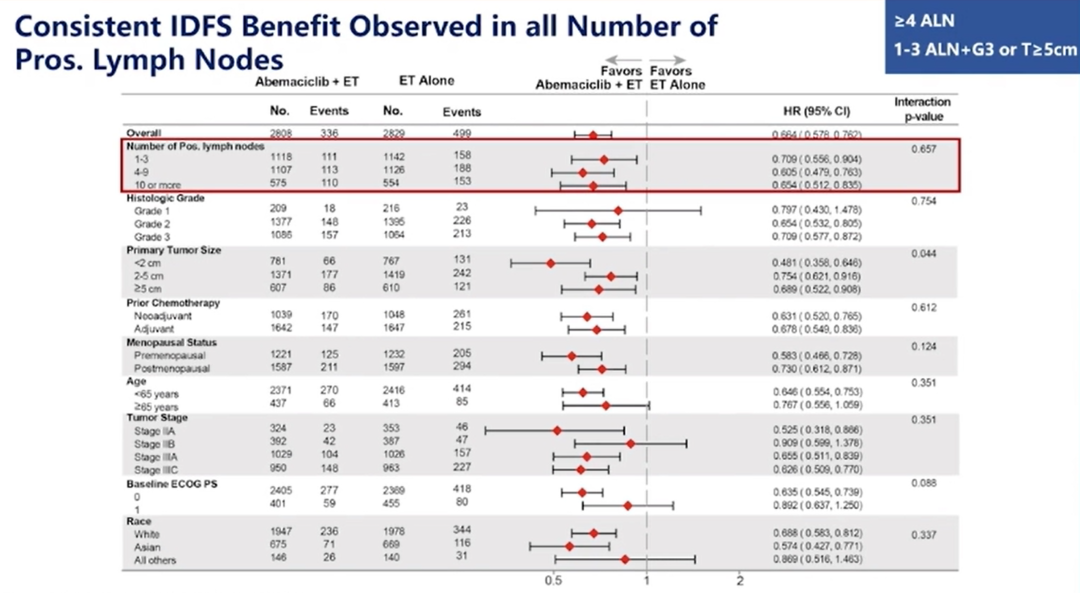首先,GEICAM 9906、2003-10等研究显示,≥4枚ALN阳性、1-3枚ALN且G3或T≥5cm的患者接受化疗联合AI辅助治疗的5年复发率高达30%。这些高危因素与MonarchE队列1入组患者相似,亚组分析显示,不同淋巴结数量患者,包括ALN 1-3枚(HR 0.709)、4-9枚(0.626)、≥10枚(0.654)均可获益。