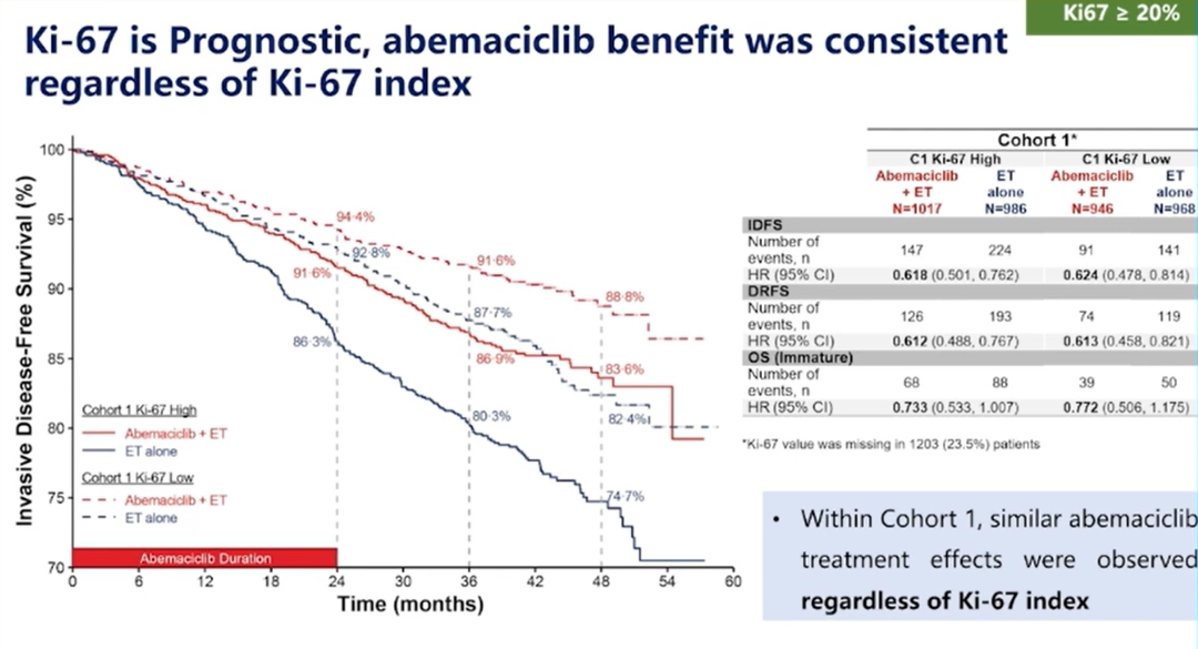 第二,EBCTCG的荟萃分析显示,Ki-67≥20%的患者预后更差,6年复发风险增加56%。MonarchE研究显示,在队列1中,高Ki-67(HR 0.618)和低Ki-67(HR 0.624)患者的IDFS获益一致,DRFS和OS也显示高Ki-67和低Ki-67患者的获益相似。