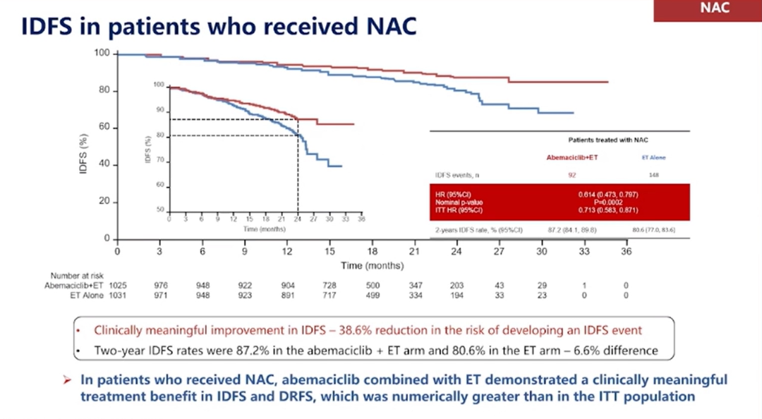 第三,MonarchE研究中接受新辅助化疗(NAC)的患者具有肿瘤体积较大、绝经前等特征。亚组分析同样显示,接受NAC(HR 0.631)与未接受NAC(0.678)患者的IDFS获益一致。不过,相较于ITT人群来看,接受NAC的患者获益幅度更大,IDFS风险降低38.6%,2年IDFS绝对获益为6.6%;而ITT人群为29%和3.5%。