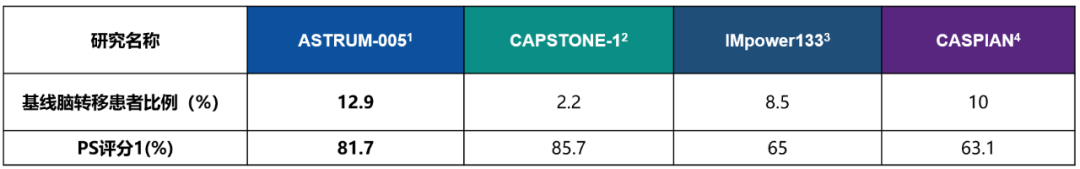 另外从入组患者PS评分来看,ASTRUM-005研究和CAPSTONE-1研究均入组超过80%PS评分1的患者,而IMpower133研究和CASPIAN研究入组PS评分1的患者均不超过65%。