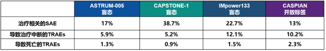 ASTRUM-005研究中斯鲁利单抗组治疗相关的SAE发生率为17%,CAPSTONE-1研究中阿得贝利单抗组治疗相关的SAE发生率是ASTRUM-005研究的2倍以上,高达38.7%;导致研究药物停用的药物相关AEs和导致死亡的与药物相关AEs发生率分别为5.9%和1.3%,与CAPSTONE-1两者的发生率相似,低于IMpower133和CASPIAN两者的发生率。其中,因为CASPIAN属于开放标签研究,其数据有可能存在一定的偏倚,更是无法跟其他几项研究做非头对头对比。