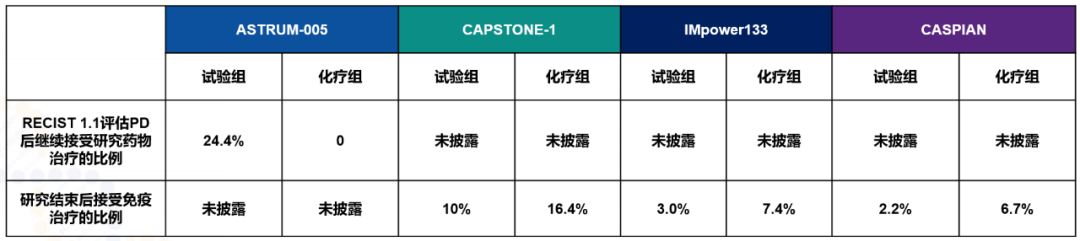 除ASTRUM-005外,其他3个研究均未披露继续接受研究药物治疗的比例,披露的是治疗结束后接受免疫药物的比例(即出组后免疫治疗的比例)。也就是说ASTRUM-005研究中公布的24.4%是经RECIST 1.1评估PD后研究者认为可继续从斯鲁利单抗中获益的比例,而其他研究中公布的是结束治疗后接受免疫治疗的比例。
