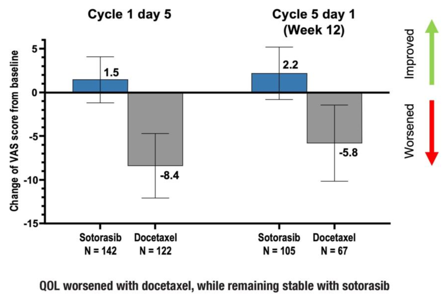 基线时两组的EuroQol-5维视觉模拟量表(EQ-5D VAS)评分相当,Sotorasib组为67.6分,多西他赛组为68.3分。然而,开始治疗后5日,接受多西他赛治疗的患者QoL恶化,但接受Sotorasib治疗的患者QoL保持稳定,EQ-5D VAS评分相对于基线的变化分别为-8.4分和1.5分。这一变化在第12周时继续维持,多西他赛和Sotorasib的EQ-5D VAS评分变化分别为-5.8分和2.2分。