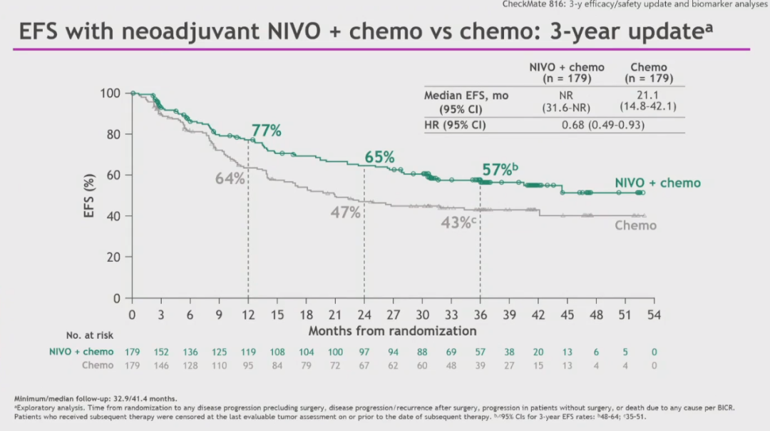 纳武利尤单抗联合铂类双药化疗作为可切除(肿瘤≥4cm或淋巴结阳性)NSCLC的新辅助治疗方案目前已在多个国家获得批准。CheckMate 816研究的无事件生存期(EFS)和病理学完全缓解(pCR)的主要分析结果发表后,该方案在很多地区已成为标准治疗。2023 ELCC发布了CheckMate 816的3年数据更新,结果清楚地表明,新辅助纳武利尤单抗联合化疗对可切除NSCLC患者持续带来EFS获益。从结果中可以看到,在新辅助免疫治疗和手术后疾病进展风险降低约40%的情况下,风险比(HR)依旧和既往数据相似。2023 ELCC还更新了总生存期数据,加强了新辅助纳武利尤单抗联合化疗方案的价值,尽管该联合方案的数据尚不够成熟,无法达到统计学显著性。此时,CheckMate 816发布的复发模式分析数据也让我们能更好地了解两组患者的复发模式差异。有趣的是,CheckMate 816研究表明,在化疗的基础上加用纳武利尤单抗三个周期,可以有效防止患者发生中枢神经系统疾病。
