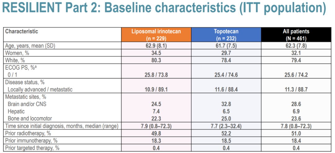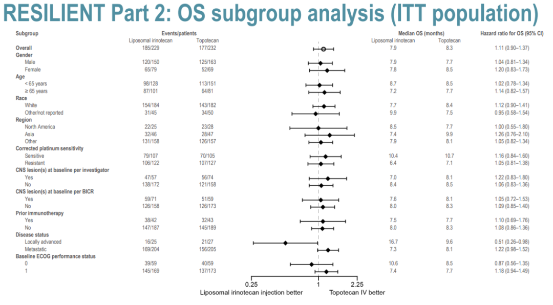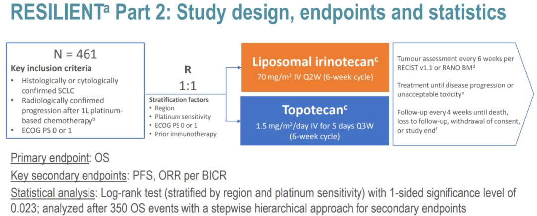 RESILIENT试验第2部分是一项随机、开放标签、III期研究,纳入了461例一线铂类化疗后发生了放射学证实的疾病进展的SCLC患者,ECOG体能状态评分为0或1分,以1∶1比例随机分组接受脂质体伊立替康(70 mg/m2,每2周1次)静脉给药或拓扑替康(1.5 mg/m2,持续5天,每3周1次)静脉给药。治疗持续至疾病进展或出现不可耐受的毒性。除OS是本研究的主要终点外,PFS和盲法独立中心审查委员会(BICR)评估的ORR是关键次要终点。