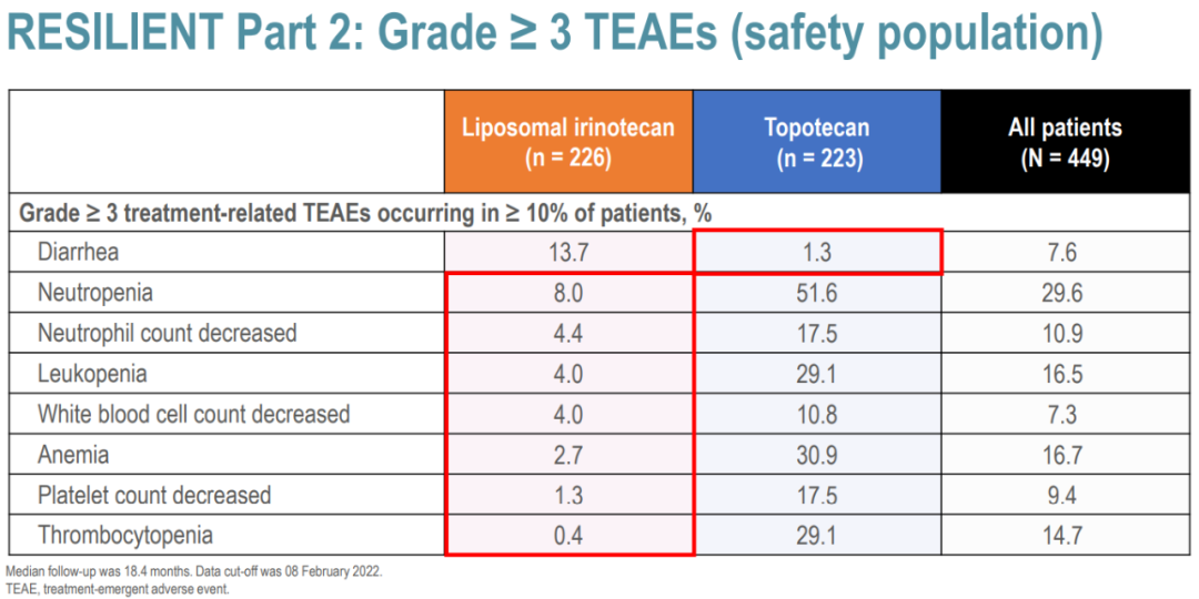 伊立替康组和拓扑替康组最常见的≥3级TEAE分别为腹泻(13.7%vs 1.3%)、嗜中性白血球减少症(8.0%vs 51.6%)、中性粒细胞计数减少(4.4%vs 17.5%)、白细胞减少症(4.0%vs 29.1%)、白细胞计数减少(4.0%vs 10.8%)、贫血(2.7%vs 30.9%)、血小板计数减少(1.3%vs 17.5%)和血小板减少症(0.4%vs 29.1%)。