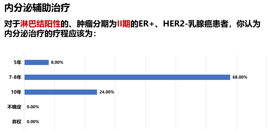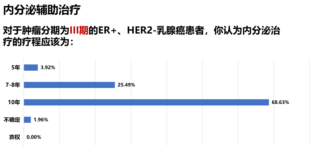 最新的2023年St.Gallen专家共识对辅助内分泌治疗的疗程相关问题进行了投票。总体上,专家是支持对高危患者进行延长内分泌治疗(包括7-8年或10年)。关于延长治疗的疗程问题,笔者认为结合更多循证进展来看,7-8年ET(其中至少5年AI)是平衡获益-风险的最佳方案;7-8年ET(其中至少5年AI)较5年ET生存获益显著改善,且与10年ET生存获益相当;7-8年ET较10年ET不良反应更低,依从性更好。