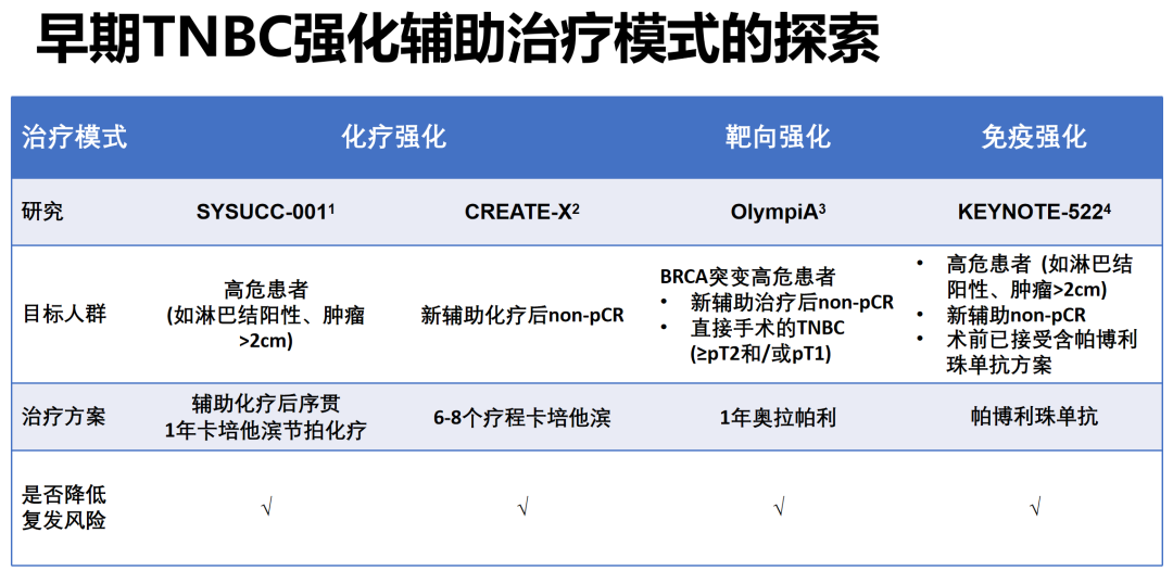 以紫杉/蒽环为基础的辅助化疗的三阴性乳腺癌(TNBC),5年的DFS不到80%。目前有以下TNBC强化辅助治疗策略。
