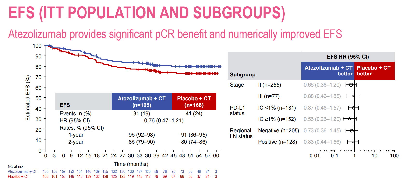 研究结果:经过中位39个月的随访,在各关键临床亚组中,EFS、DFS和OS在数值上均有较好的表现。在未达到pCR的患者中,阿替利珠单抗组14/70(20%)和安慰剂组33/99(33%)均接受了额外的辅助全身性治疗,最常见的是卡培他滨(4/70[6%]vs 26/99[26%])。在探索性分析中,pCR对长期结局具有高度预后意义。探索性ctDNA分析表明,大多数患者(包括所有ctDNA可评估且pCR的患者)在手术时被清除。手术时或术后ctDNA阳性与不良预后相关。阿替利珠单抗组未出现新的安全信号,也未出现与治疗相关的死亡。