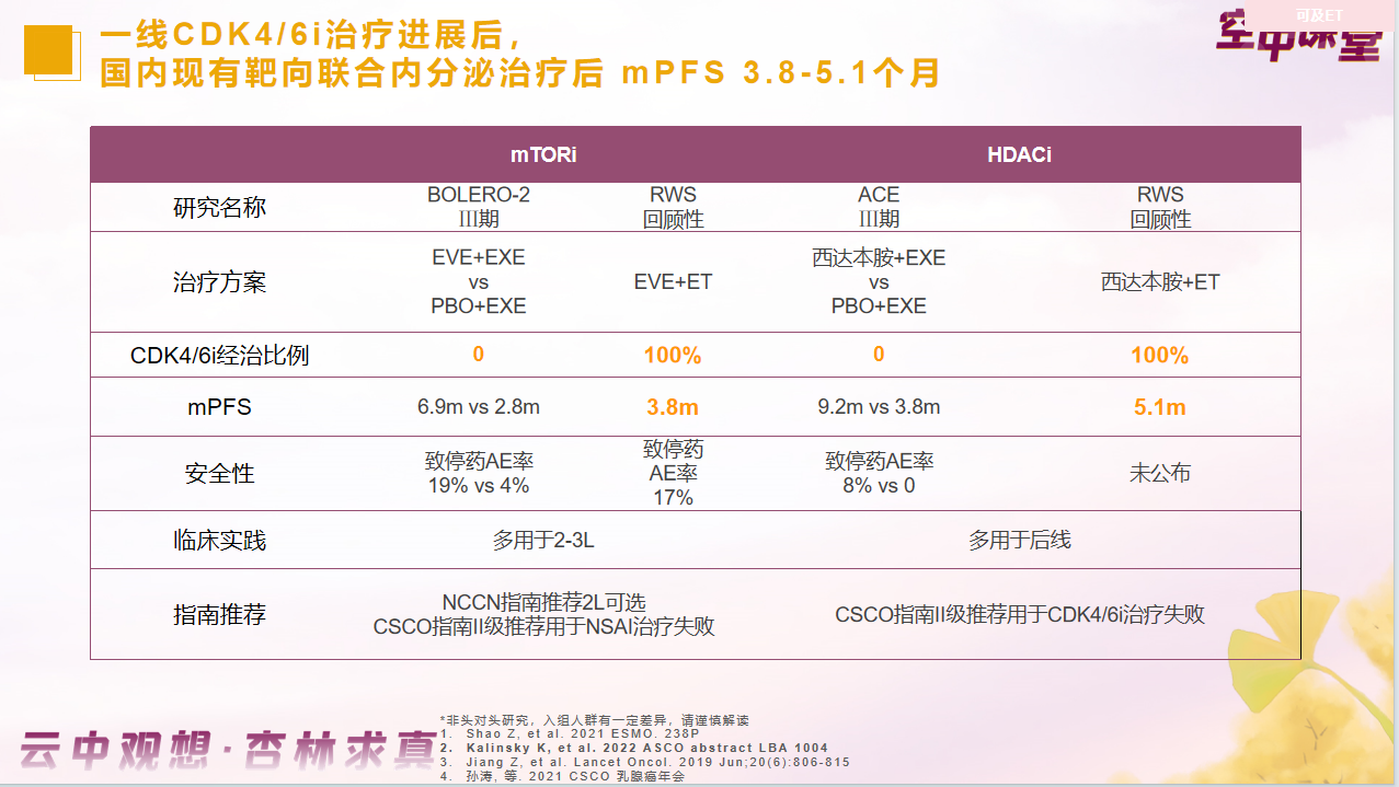 一线CDK4/6i治疗进展后,换用国内现有的其他靶向治疗联合内分泌治疗的数据结果也不乐观。回顾性数据显示mTOR抑制剂+ET的mPFS仅为3.8个月[22],西达本胺的回顾性真实世界研究数据显示,西达本胺+ET治疗CDK4/6i进展患者的mPFS仅5.1个月[23],远不能满足患者需求。