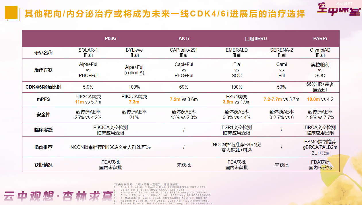 虽然HR+晚期乳腺癌患者的一线治疗方案已经明确,但一线CDK4/6i+ET进展后的治疗选择,当下国内外指南并无标准统一推荐。2023年第四版NCCN指南提出,仅有有限数据支持CDK4/6i跨线治疗,二线治疗的可选手段包括PI3K抑制剂(PIK3CA突变)、依维莫司+ET[19]。对于一线CDK4/6抑制剂+内分泌治疗后,无内脏危象及PFS较长的患者《ESMO转移性乳腺癌指南》[21]也进行了治疗推荐,可选手段包括:依维莫司+依西美坦/氟维司群;换用其他内分泌治疗±CDK4/6i;PI3Ki+氟维司群(PIK3CA突变);Elacestrant(ESR1突变);PARPi(BRCA/PALB2突变)。