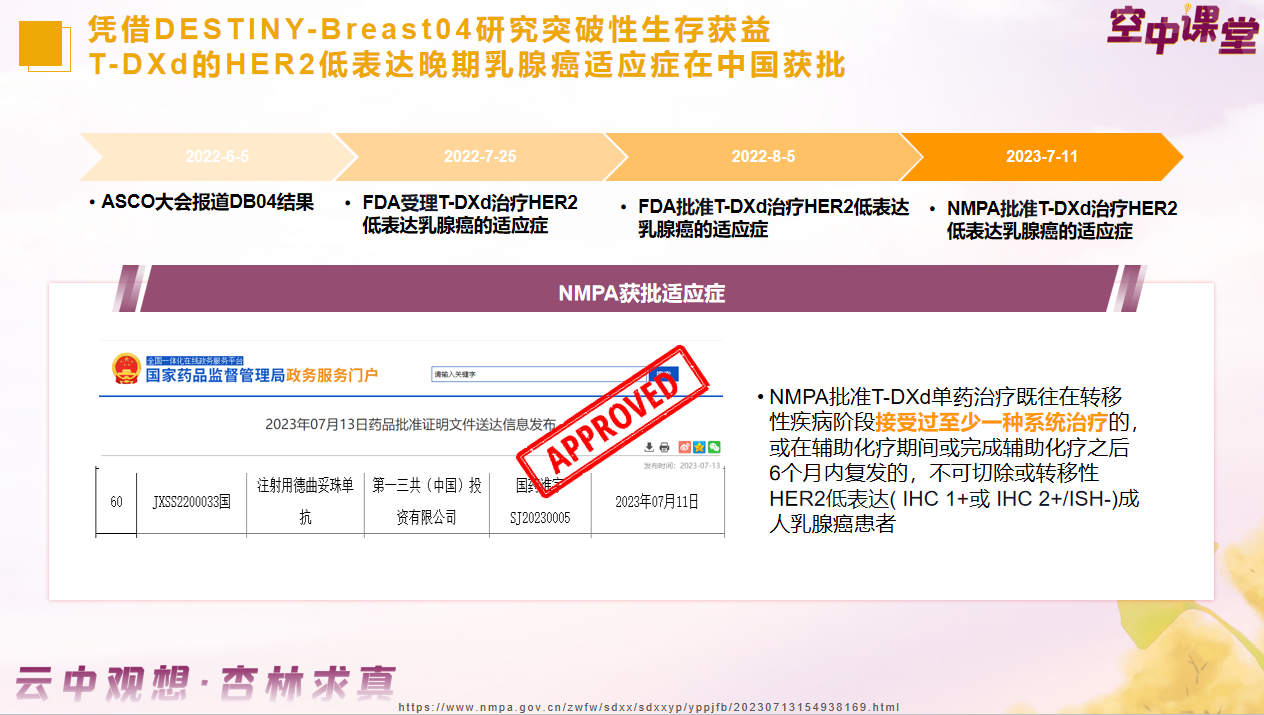 凭借DESTINY-Breast04研究突破性生存获益,T-DXd的HER2低表达晚期乳腺癌适应症在中国获批[31]:T-DXd单药治疗既往在转移性疾病阶段接受过至少一种系统治疗的,或在辅助化疗期间或完成辅助化疗之后6个月内复发的,不可切除或转移性HER2低表达(IHC 1+或IHC 2+/ISH-)成人乳腺癌患者。T-DXd是国内首个且目前唯一一个获批的用于HR+晚期乳腺癌的ADC药物,为此类患者带来了治疗希望。