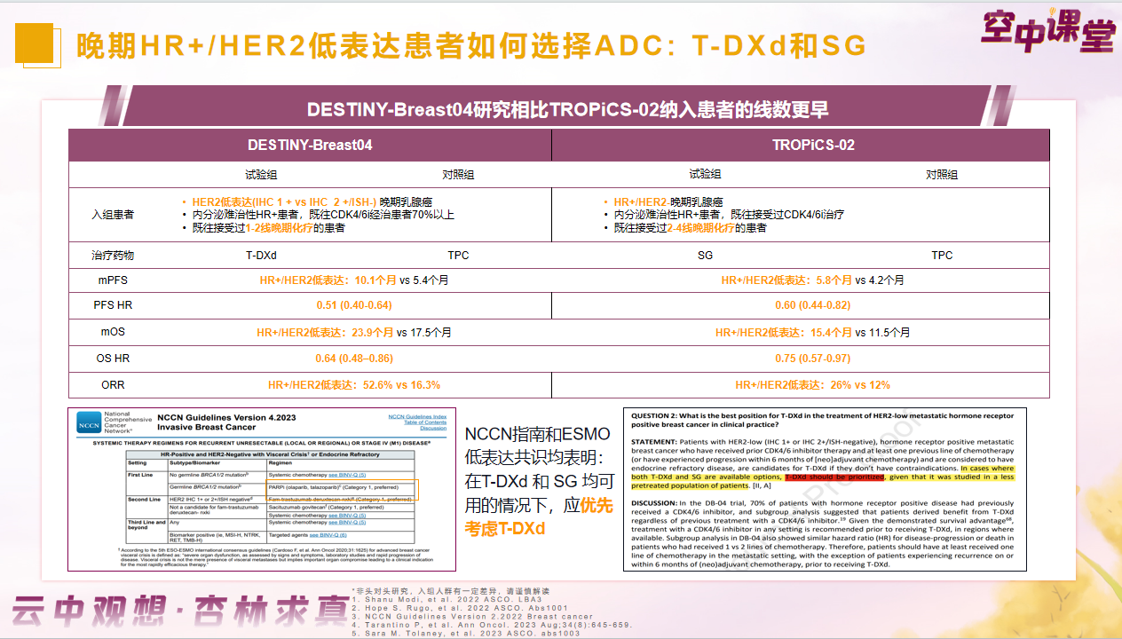 编者按:目前,CDK4/6抑制剂联合内分泌(CDK4/6i+ET)治疗已成为HR阳性晚期乳腺癌患者的标准一线治疗方案。但一线CDK4/6i+ET进展后的治疗选择,当前国内外指南并无标准统一推荐。以T-DXd为代表的新型ADC药物,为后CDK4/6i+ET时代提供了新的选择。本期《空中课堂》栏目,我们特邀湖南省肿瘤医院欧阳取长教授为我们详解HR+晚期乳腺癌最优治疗策略。