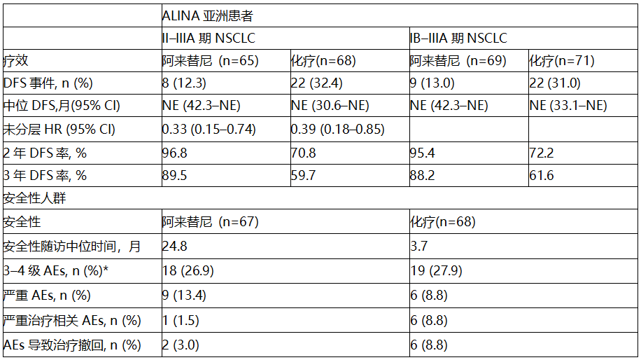 在亚洲患者中观察到阿来替尼相比化疗产生具有临床意义的DFS获益(IB-IIIA期:HR=0.39, 95% CI: 0.18-0.85)和CNS-DFS获益(IB-IIIA期:HR=0.24, 95% CI: 0.05-1.12)。OS数据不成熟。阿来替尼的总体安全性与已知的风险概况基本一致。