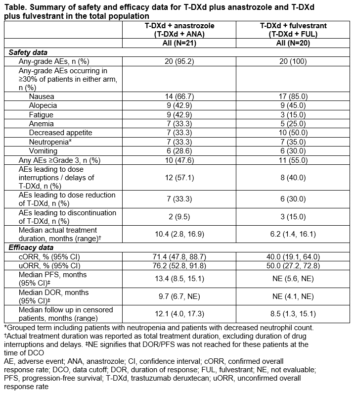 段海波教授:T-DXd的“命运”系列研究在HER2低表达领域率先取得突破,是HER2低表达的开拓者和先锋官,备受国内外专家关注。本次大会公布了T-DXd的DESTINY-Breast08的研究[7],这是一项Ⅰb期、多中心、剂量拓展研究。主要探索T-DXd联合阿那曲唑(ANA)或氟维司群(FUL)治疗HER2低表达/HR+晚期或转移性乳腺癌的效果。此项研究中,T-DXd+ANA组21例,T-DXd+FUL组20例,分别有67%vs 75%的患者接受过前序ET±靶向治疗,余下均为一线治疗。研究结果显示,T-DXd+ANA组vs T-DXd+FUL≥3级不良事件(AE)为47.6%vs 55.0%,ILD分别为3例和0例,均为2级。cORR为71.4%vs 40%,OS还不成熟。该研究初步提示了对于HER2低表达/HR+乳腺癌患者应用T-DXd联合内分泌治疗可行性。