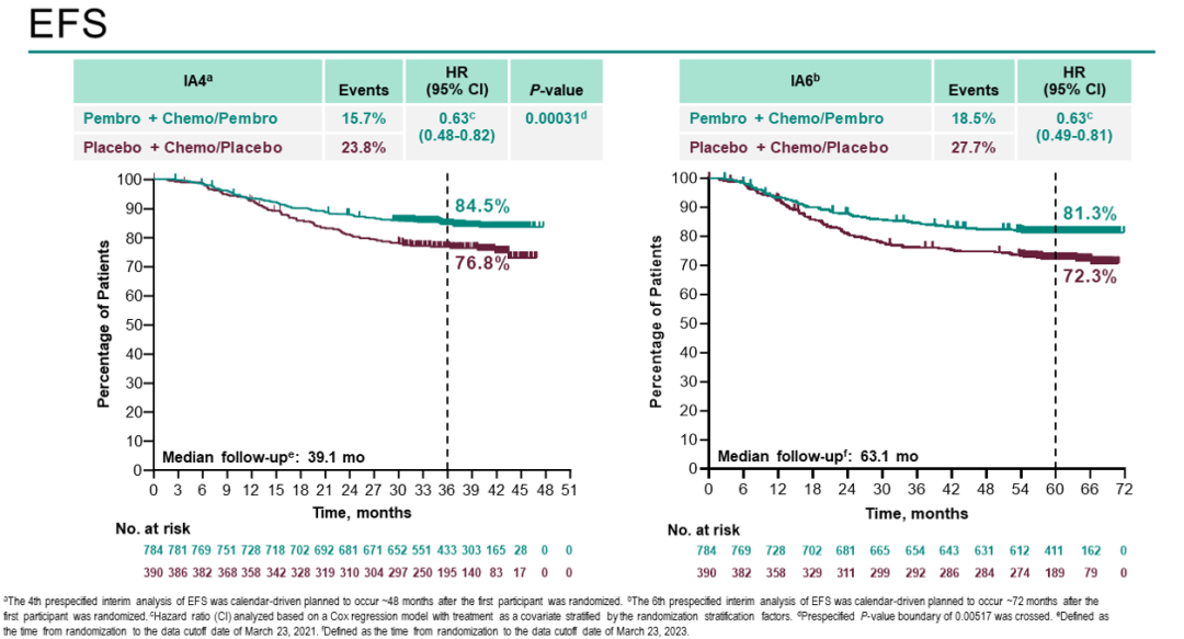 李俏教授:KEYNOTE-522研究进行了多次中期分析,2023年ESMO大会中更新了第六次预先设定的EFS中期分析结果。在本次中期分析中,我们继续看到帕博利珠单抗组5年EFS率的进一步获益,与单纯化疗组的组间差异达到了9%(81.3%vs.72.3%),相较于第4次中期分析的7.7%(84.5%vs.76.8%),患者获益得到了持续扩大。KEYNOTE-522的重要性在于,研究组不仅获得了近期疗效pCR率的显著提升,5年EFS率也相较于三年随访结果进一步升高。中位随访时间63.1个月,帕博利珠单抗组和单纯化疗组分别有145例(18.5%)和108例(27.7%)发生事件,HR值为0.63,维持了之前的获益水平。