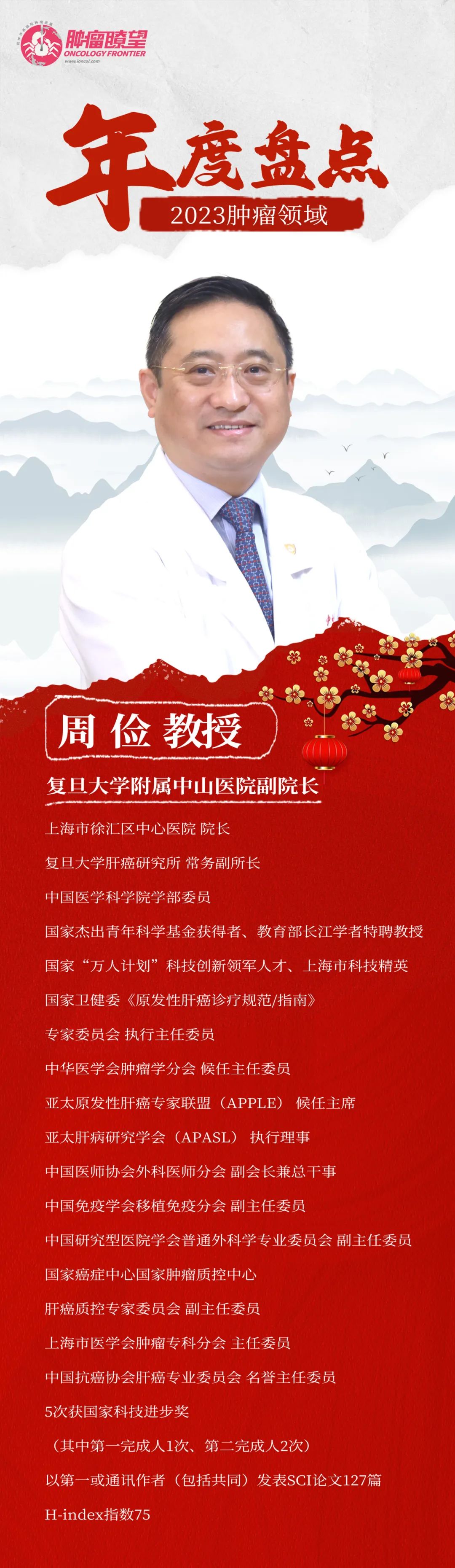 ?编者按:肝癌是我国常见的恶性肿瘤之一,也是慢性病毒性肝炎患者常见的死亡原因之一。全球近一半左右的肝癌发生和死亡在中国,而且中晚期比例高,我国肝癌病人5年总生存率不足15%。在沉重的疾病负担下,中国肝癌学者坚持不懈地研究探索,在肝癌的系统治疗和局部治疗以及转化治疗中摸索出许多“中国经验”,为全球贡献众多“中国方案”。2023年已经落下帷幕,过去一年中肝癌治疗领域有哪些重要研究进展?《肿瘤瞭望》特邀复旦大学附属中山医院周俭教授进行年度盘点。