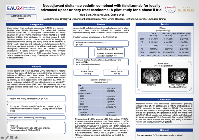 结论:在局部晚期UTUC中,无论HER2表达情况如何,维迪西妥单抗联合替雷利珠单抗均显示出有前景的疗效,pCR率为21.43%,ORR为78.57%。联合治疗也显示出可控的安全性。本研究是局部晚期UTUC(cT2-4N0-2M0)新辅助治疗的前瞻性、单臂Ⅱ期试验(WUTSUP-02)的先导性研究。正在进行中的WUTSUP-02试验将进一步评估在UTUC患者中使用维迪西妥单抗联合替雷利珠单抗的疗效和安全性。
